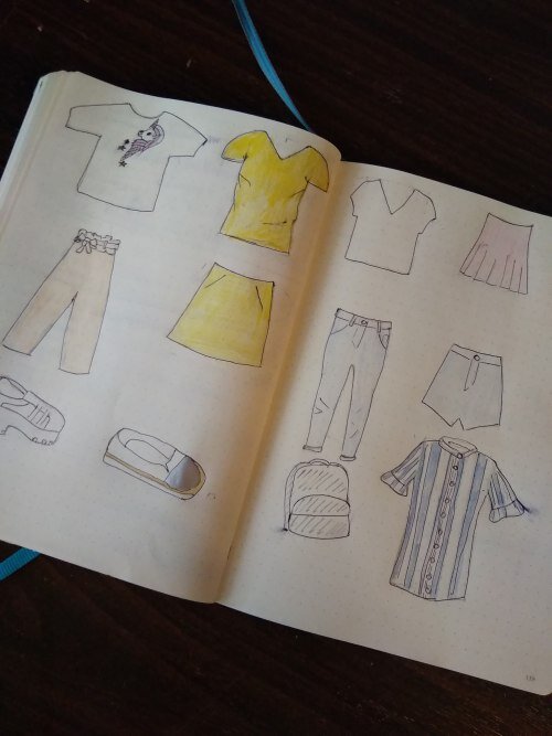 В июле мне предстоит поездка в жаркую страну (но не на пляж, это будет мегаполис). Я очень не люблю ездить в путешествия с тяжёлой сумкой. Так что я решила взять с собой минимум вещей, при этом иметь возможность каждый день разнообразить свой гардероб. Я узнала ранее, что самое главное, когда мы составляем капсулу - это то, что каждая следующая вещь сочитается с предыдущей. Также идеальным вариантом будет взять 2 низа, 3 верха, 1 платье и жакет (моя капсула немного отличается в этом моменте). То есть вы берете что-то из имеющего низа и под него можете одеть любую из 3х футболок, что у вас есть. Я решила прикинуть, как я могу составить свою капсулу, для этого использовала те вещи, что у меня уже были, ну и пришлось купить кое-что нового. Из 6 вещей у меня получилось 7 нарядов. Пока это маловато, но мне срочно нужно докупить ещё хотя бы 1 топ, тогда количество нарядов увеличится ещё на три. Я решила зарисовать вещи из своей капсулы, а после и вырезать, чтобы комбинировать вещи стало ещ