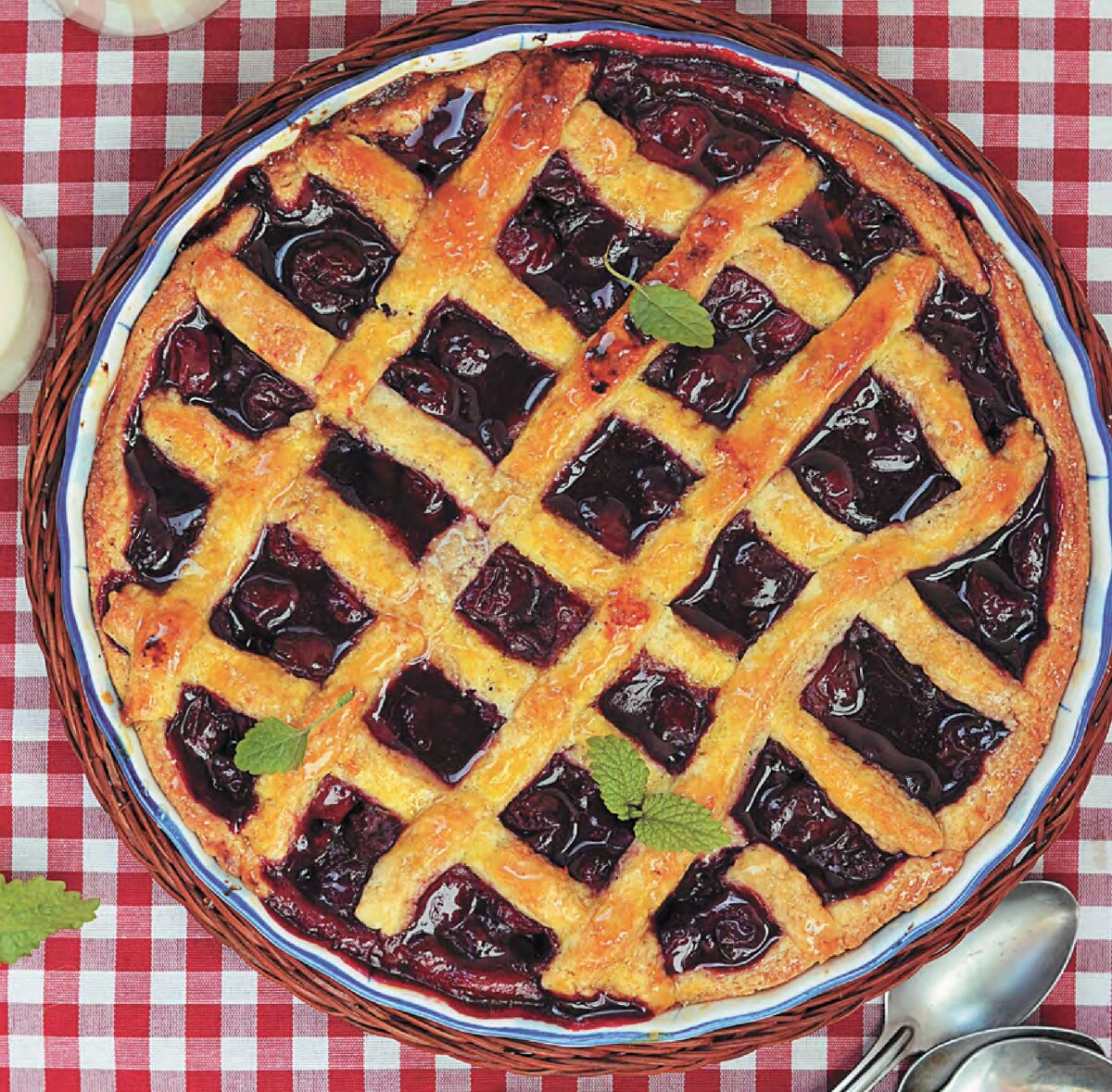 Ингредиенты: 300 г муки 210 г сливочного масла 1 кг вишни 200 г сахара 2 ст. л. крахмала 1/4 ч. л. корицы 1/4 ч. л. соли 1/4 ч. л. мускатного ореха 2 ч. л. лимонного сока 1 желток Приготовление: 1. Для теста: муку порубить с маслом в крупную крошку, добавить соль, 2—3 ст. л. холодной воды и замесить тесто. Собрать тесто в шар, завернуть в пищевую пленку и дать постоять в холодильнике около 30 минут. 2. Для начинки: в ковшике соединить сахар, корицу и мускатный орех. Добавить стакан воды или вишневого сока (если вы используете консервированную или размороженную вишню). Довести сироп до кипения. Отдельно растворить крахмал в четверти стакана воды. Добавить в сахарный сироп, довести смесь до кипения и прокипятить в течение 1 минуты. Затем добавить вишню и прогревать начинку 2—3 минуты. Снять с огня, вмешать лимонный сок. Готовую начинку остудить. 3. Тесто раскатать и выложить в форму диаметром 22 см, сформировав бортики. Выложить на тесто охлажденную начинку. Из обрезков теста нареза
