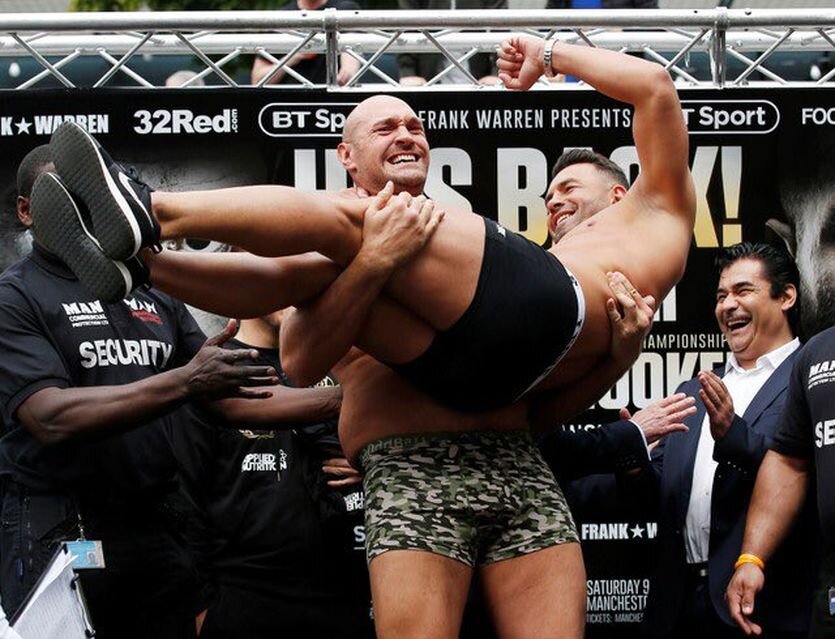 Тайсон Фьюри и Сефер Сефери устроили шоу на дуэли взглядов. Веселые новости бокса обеспечили Британец Тайсон Фьюри (25-0, 18 КО) и албанец Сефер Сефери (23-1, 21 КО) прошли официальное взвешивание перед боем. Самые свежие новости бокса на NewsSport Вес Фьюри составил 276 фунтов (125,191 килограмм), а Сефери — 210 фунтов (95,244 килограмма). Смотреть видео Фьюри и Сефери превратили свое взвешивание в настоящее шоу. Во время традиционной битвы взглядов оба по очереди начали становиться на цыпочки. После этого Фьюри поднял соперника на руки, а затем это пытался сделать уже Сефери. Читайте самые свежие новости бокса на NewsSport