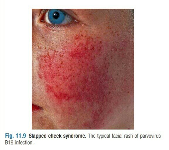 Парвовирус В19 вызывает кожную сыпь и другие клинические синдромы. Около 50% детей и 60-90% взрослых являются серопозитивными. Большинство инфекций распространяются по дыхательному тракту, хотя распространение через зараженную кровь также возможно. Вирус имеет особую тропность к предшественникам эритроцитов. Клинические особенности Многие инфекции протекают скрыто. Клинические проявления возникают после инкубационного периода, который длится 14-21 день. Продромальная лихорадка и симптомы кори предшествуют классической эритемы ( инфекционная эритема ). Характерной особенностью является синдром «следов от пощечин», который может стремительно изменяться. Появление синдрома «следов от пощечин», который сопровождается макулопапулезной сыпью, прогрессирующей до сетчатого высыпания на теле и конечностях, а затем на заключительном этапе разрешения. У взрослых распространена полиартропатия и характеризуется симметричным поражением малых суставов. У детей асимметричное поражение крупных