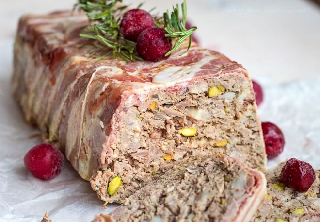 Лучший паштет – это террин, считали французские монархи. Ведь не зря же это блюдо во Франции прозвали «отрада королей». Готовили отраду на любой вкус – почти из 200 различных ингредиентов. Придворные повара придумывали всё новые и новые рецепты паштетов. Добавляли фисташки, трюфели, спаржу и другое. До нашего времени дошли рецепты паштетов немного видоизмененные. Сегодня представляю вам один из самых вкусных рецептов террина. Свиной террин с курагой и фисташками Ингредиенты: 650 г свиного фарша 150 г бекона 3 ст.л. бренди 50 г фисташек 40 г кураги 2 зубчика чеснока Тимьян Зеленый лук Петрушка Соль, перец Способ приготовления Жаропрочную форму смажьте маслом. Выложите на дно формы ломтики бекона так, чтобы их края свешивались за пределы формы. Фарш смешайте с бренди, мелко нарезанным чесноком, зеленым луком, тимьяном, петрушкой. Орехи очистите, и добавьте в фарш. Посолите, поперчите и перемешайте. Курагу разрежьте пополам. Выложите половину фарша в форму поверх бекона. Разложите свер
