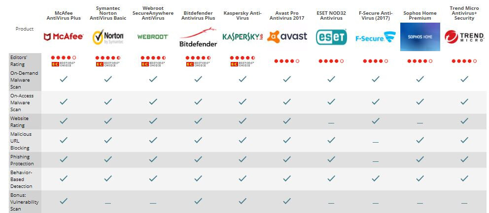 Какой антивирус вам следует выбрать? У вас есть множество вариантов. Антивирус Касперского и Bitdefender регулярно занимают первые места в рейтинге п тестам независимых лабораторий. В практических тестах Norton превзошла все остальные недавние продукты, кроме Webroot. Единая подписка на McAfee позволяет устанавливать защиту на всех устройствах Windows, Android, Mac OS и iOS. И его необычная поведенческая технология обнаружения означает, что Webroot SecureAnywhere Antivirus - это самый крошечный антивирус. Мы назвали эти пять продуктов «Выбор редакции» для коммерческого антивируса, но они не единственные, заслуживающие внимания.