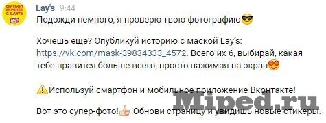 5) Для получение второй части стикеров нужно сделать селфи с пачкой чипсов Lay's. (футбольной серией) Можно попробовать найти в интернете, но бот проверяет фотографию на уникальность.