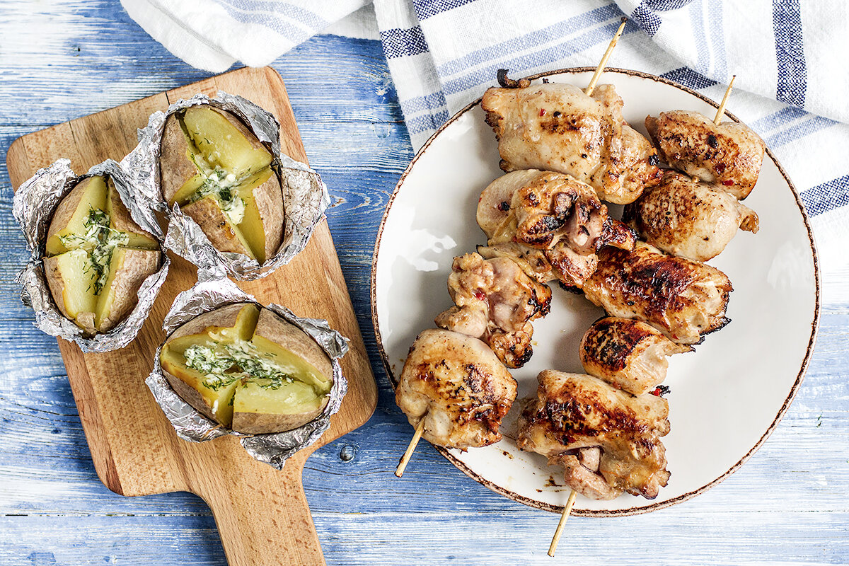 На вкус и цвет, как говорится. Множество моих знакомых (в основном, подруг) любит шашлык из курицы. Вроде, он нежнее, даже будто диетический. Действительно, если готовить шашлык из куриной грудки, то получится очень легко. Самые популярные части курицы для приготовления шашлыка — крылья и голени. Но самой удачной частью считается филе бедра — оно сочное, мягкое. С ним-то мы и поэкспериментируем. Еще приготовим гарнир. Любимый печеный картофель. С ароматной начинкой. Что нужно: Филе куриного бедра (цельное) 500 г Сладкий соус Чили 30 мл Соевый соус 30 мл Сливочное масло 50 г Коричневый сахар 10 г Жидкий дым 5 мл Фольга штучный 1 шт. Перец Чили 1 шт. Картофель 550 г Чеснок 3 зуб. Укроп 1-2 вет. Зеленый лук 10 г Шпажки 4 шт. Ориентировочное время приготовления 30 мин. на маринование + 40-50 мин. на обжарку. Сливочное масло должно быть мягким, комнатной температуры. Для этого предварительно достаньте его из холодильника, либо в процессе подогрейте в СВЧ-печи 10-15 сек. Если вы хо