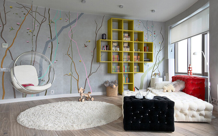 Светлые тона, авторская роспись стен, дизайнерская мебель в стиле и красках поп-арт с элементами стиля 1960-х. Интерьер выглядит модно и артистично.