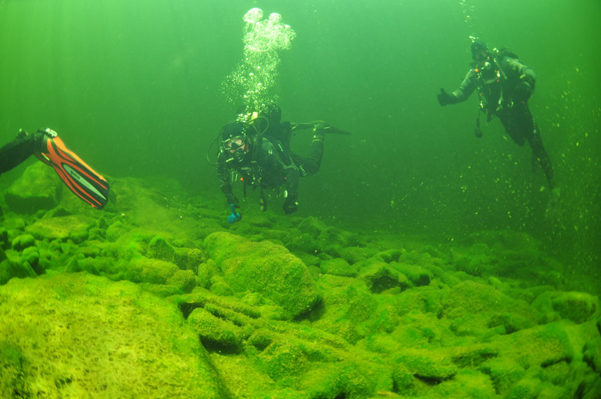 В 2015 году мы с коллегами отправились на подводную охоту на Байкал. Так уж вышло, что это было общим хобби, поэтому все необходимое снаряжение у каждого было свое. Лодку арендовали на месте, перекусили, дождались вечера и, в предвкушении хорошего улова, отчалили. Немного отплыв от берега, мы увидели синее свечение на поверхности воды метрах в 100 от лодки. Естественно, нам стало интересно, что там может быть, и мы направили лодку в известном направлении. Подойдя к нужной точке, мы решили погрузиться в воду и найти источник света. Глубина в том месте была не более 30 метров, но дно не просматривалось. К сожалению, профессиональных ныряльщиков среди нас не было, а акваланги на подводной охоте запрещены. Дольше всех из нас дыхание задерживали я и Сергей, поэтому все решили, что нырять надо нам. В следующую минуту мы уже скрылись под поверхностью воды и медленно уходили вниз прямо вдоль синего столба света. Погрузившись метров на 10, мы смогли рассмотреть что-то вроде полусферы более