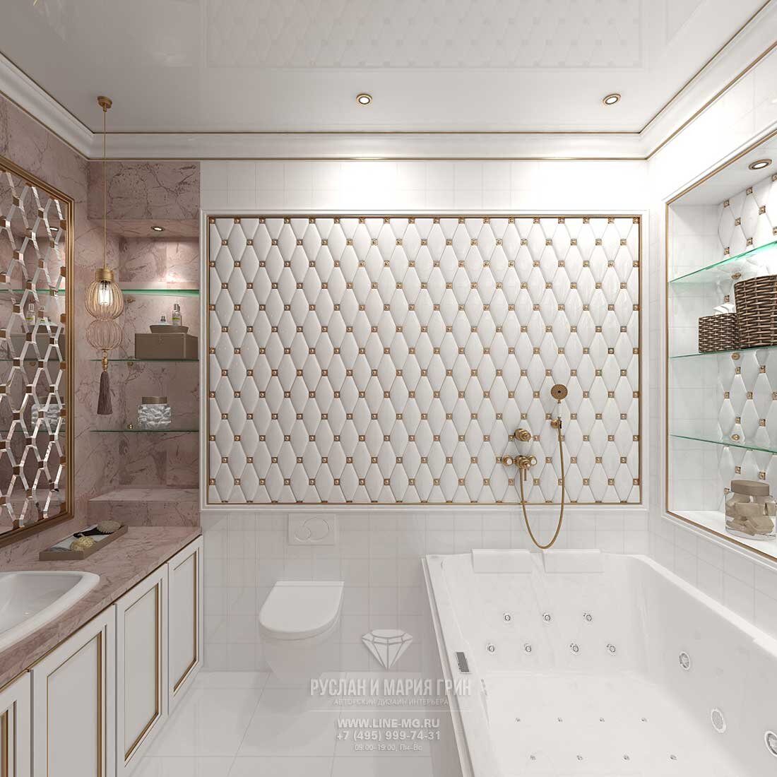 Плитка — это самый популярный материал для отделки ванных комнат. Она не боится воды, легко моется и может порадовать потребителя большим количеством доступных узоров и оттенков. Частные дизайнеры Руслан и Мария Грин учли это при работе над своими проектами и создали новые интерьеры ванных комнат с использованием модной плитки. ПЛИТКА, ИМИТИРУЮЩАЯ КАРЕТНУЮ СТЯЖКУ На фото: Модная плитка в дизайне ванной комнаты В первом проекте вы увидите сочетание разных видов плитки в помещении с мягким и нейтральным по колористике интерьером. Все использованные здесь материалы отличаются друг от друга размером, цветом и узорами. Тут вы найдете белое глянцевое покрытие с золотистой отделкой и мраморную плитку цвета какао. Однако на фото ванной комнаты в первую очередь ваше внимание привлечет необычная плитка ромбами. Профессионально выложенная на стене плитка объемной формы с закругленными, выступающими краями разбавлена золотистыми вкраплениями, дополнительно подчеркивающими каждый ромб мозаики. Так
