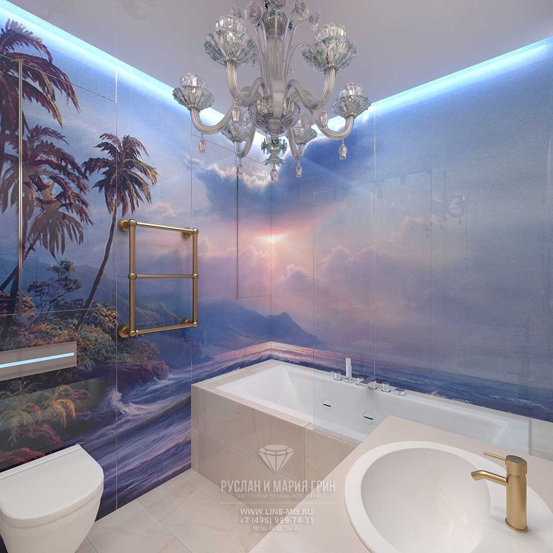 В рамках работы над проектом дизайна квартиры в ЖК «Долина Сетунь» Руслан и Мария Грин спроектировали интерьеры двух санузлов, один из которых находится при спальне, второй же предназначается для детей. Интерьеры этих ванных комнат отличаются высоким функционалом при достаточно богатом декоре. Так, в дизайне совмещенного детского санузла, где, благодаря фотопечати, создается иллюзия пребывания на побережье тропического острова, прозрачная перегородка позволяет использовать ванну в качестве душевой. Такое решение способствует более эргономичной организации пространства. ОТТЕНКИ ФУКСИИ В ДИЗАЙНЕ САНУЗЛА ПРИ СПАЛЬНЕ: ФОТО В дизайне ванной комнаты при спальне одну из главных декоративных ролей играет мозаичная плитка, которую можно отнести к числу актуальных на сегодня современных идей отделки интерьеров санузлов. В данном проекте мелкой мозаикой отделана душевая, которая, благодаря наличию в ней скамьи, несколько напоминает полноценную парную в сауне. Яркие оттенки фуксии мозаичной плитк