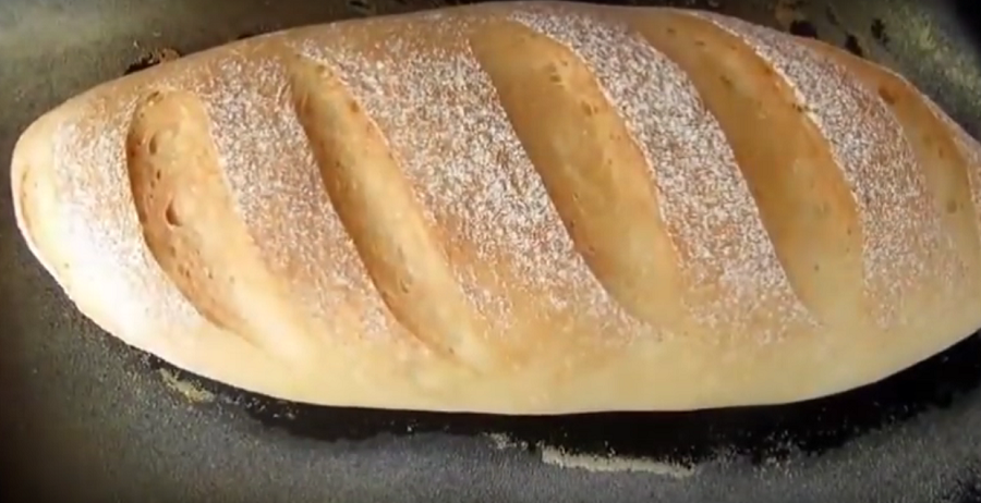 - Подошедший батон выпекаем в духовке, разогретой до 200 градусов, 35-40 минут. И все, хлеб готов. Даем ему немного остыть и подаем к столу.