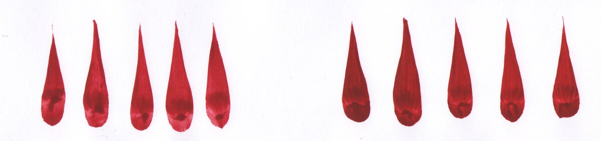 Мазок №5. «Боковая капелька». Начинается как обычная капелька, но во время движения смещаем кисточку немного в сторону. Получается капелька со смещением вправо или влево.