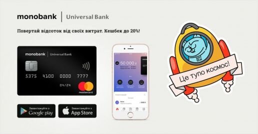 Monobank. Первый в Украине мобильный банк без отделений. Чтобы стать клиентом, нужно иметь смартфон на Android или iOS. Геотаргетинг: Доставка: Киев, Харьков, Одесса, Львов, Днепр, Запорожье Все точки выдачи карты Monobank: Белая Церковь, Бердянськ, Бровари, Винница, Вишгород, Днепр, Днепропетровск, Дрогобич, Житомир, Запорожье, Ивано-Франковск, Каменское, Киев, Кременчуг, Кривой Рог, Кропивницкий, Луцк, Львов, Мариуполь, Николаев, Одесса, Павлоград, Полтава, Ровно, Сумы, Тернополь, Ужгород, Харьков, Херсон, Хмельницкий, Черкассы, Чернигов, Черновцы. Заказать можно перейдя по ссылке https://goo.gl/69NKMt