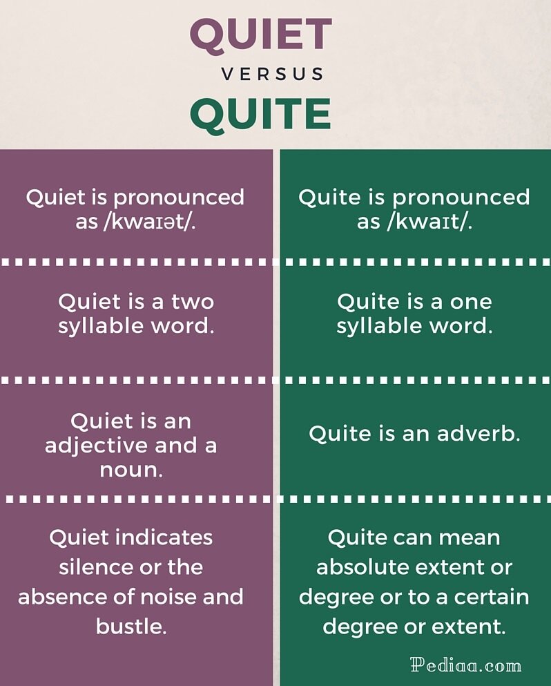 Глагол to quiet призывает успокоиться или успокоить кого-либо (She tries to quiet the class). Quit [kwɪt] — глагол, который означает освободиться от чего-либо (уволиться, например) или перестать делать что-либо (quit a job, quit smoking). Quite [kwaɪt] — это наречие, которое означает довольно, совершенно, полностью (She is quite famous). Примеры предложений с Quiet, Quite и Quit It’s often quite noisy at our house, so it would be difficult to find a quiet place. (В нашем доме часто шумно, поэтому было бы трудно найти тихое место.)