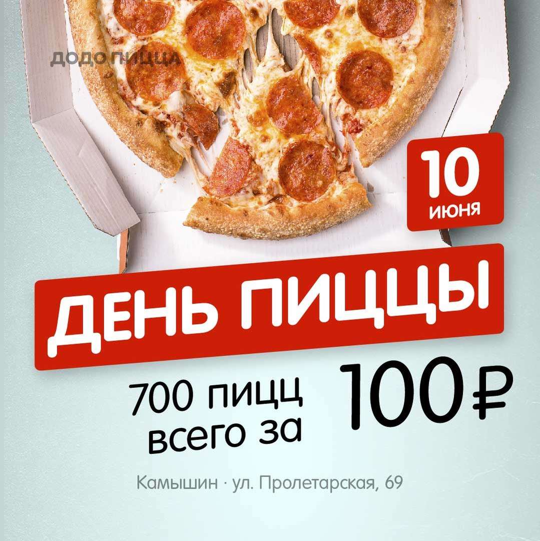 10 мая "Додо Пицца Камышин" объявила об акции "День Пиццы",которая заключается в том, что первым 700 покупателям достанется пицца всего за 100 рублей. Это самая масштабная акция в городе Камышин Ход событий "Дня Пиццы" в "Додо Пиццы" Пиццерия в г.Камышине открывается в 9:00 ,но самые первые посетители заняли очередь в 6:25,для того чтобы самыми первыми оценить вкусную пиццу по 100 рублей. Мы с друзьями пришли в 8:10 и в очереди уже были люди (от 20 человек). Буквально через минут 20-30 начали подходить ещё люди. Очередь начала увеличиваться. К отркытию пиццерии диджей начал включать музыку. Стало веселее. Затем подключились детские аниматоры и начали развлекать детей на специальной детской площадке. Так же разыгрывались разные призы кто стоял в очереди (футболки,книги,магниты) .Также разыгрывался сертификат на метровый саб от "Suubway" . Был проведён