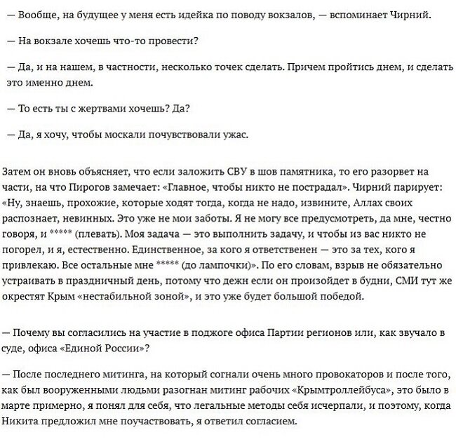 В последствии, убедившись в неопровержимости доказательств, Чирний и Афанасьев дали показания на Сенцова, полностью подтверждающие версию о подготовке теракта. Вот небольшая выдержка из протоколов допросов подельника Сенцова Чирния, представленных на суде: