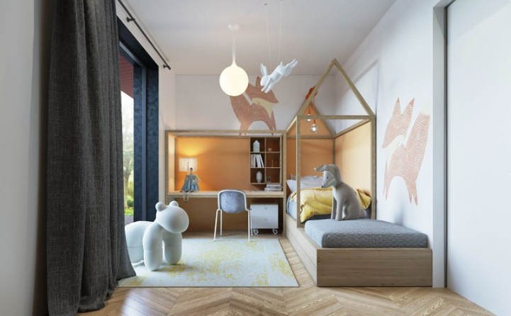 Стильные детские комнаты 1. Очень веселый и свежий дизайн детской комнаты. Хотя эта комната и предназначена для меньших деток, но несомненно, придется по душе и более взрослым, ведь на такая милая. Светлые мандариновые стены над кроваткой и прекрасно раскрыта тема лесных зверей. Также в этом стильном дизайне детской комнаты очень много пространства для хранения вещей. Есть и ящики под кроватью, деревянные полочки на стене и массивный письменный стол. Еще одним забавным элементом комнаты являются лампочки висящие над рамой кровати. Каркас кровати тогда становится многофункциональным – место, где дети могут повесить рождественские огни, прикреплять свое искусство и фотографии, или поднять одеяло и сделать палатку. 2. Интерьер этой детской комнаты довольно забавный. Ребенок нуждается в пространстве, чтобы играть, и в этой комнате оно есть, что бы ребенок развивал свое творчество. На протяжении многих лет полки в этой комнате повидают много игрушек и учебников. Это необычный дизайн