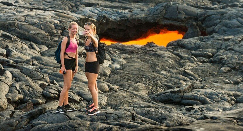 И туристы, и местные «аборигены» упорно снимают себя на фоне извергающегося вулкана Килауэа. Продолжающий извергаться вулкан Килауэа на Гавайях насколько опасен, настолько и красив. Поэтому не только туристы, но и местные жители грешат тем, что делают сэлфи на фоне извергающейся лавы.
