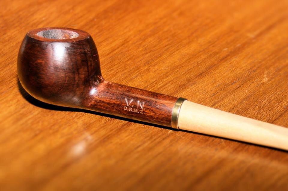 Вот такая трубка, с клеймом "V.N.", поселилась в музее Vauen, в Нюрнберге. Если б мне попалась такая трубочка, мнение был б однозначным - очередная "деревяшка". Ан, нет! В сопроводительном буклете говорится, что трубочка эта сделана на Vauen. Но 1947 год был довольно тяжёлым для компании, что бы выпускать трубки из качественного бриара. В том же буклете, спецы Vauen, уверяют, что скоро всё встанет на свои места и они начнут радовать курильщиков трубками с клеймом "Vauen". Ну, а пока.... Пока только "V.N.".