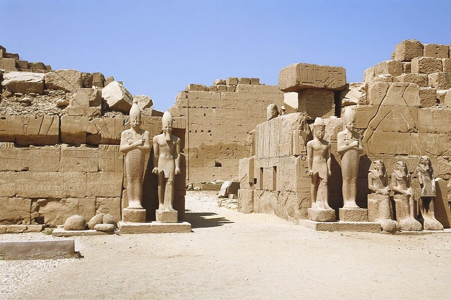 Когда Шампольон прошел через огромные ворота (почти 44 метра высотой и 113 метров шириной), чьи гигантские каменные блоки 15-метровой толщины защищали святилище, он очутился в огромнейшем дворе одного из величайших храмов Древнего Египта. Самый большой храм Карнака был посвящен Амону, богу ветров и воздуха. Его изображали в короне из двух высоких перьев, а священным животным бога Амона был овен. Поначалу Амон был зависимым местным божеством, но фараоны Нового царства превратили его в общенационального бога. С XVI века Амон стал идентифицироваться с богом Солнца – Ра. В начале периода Нового царства небольшой храм Амона был увеличен фараоном Тутмосом I, а его преемники расширили храм еще больше.