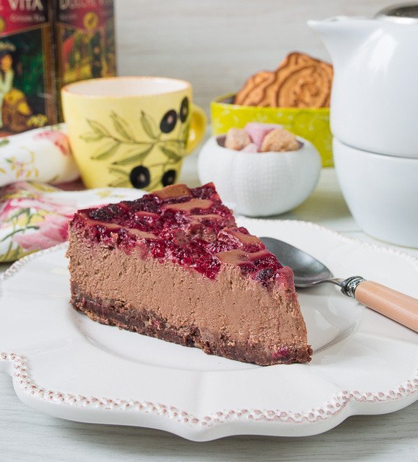 4. Шоколад растапливаем на водяной бане и добавляем в начинку. Тщательно перемешиваем. Переливаем начинку в форму поверх запеченной основы. Сверху выкладываем малину (можно предварительно не размораживать).