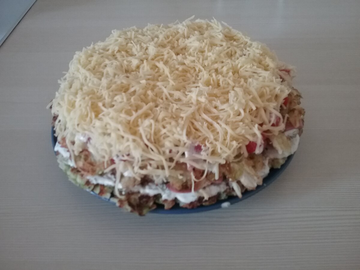 Он может быть картофельный, кабачковый, у меня капустный. Милых дам в статье ждет подарок, заходите, не пожалеете! Для моего капустного тортика Вам понадобится: 0,5 качана капусты 2 яйца 2 столовые ложки манки 6 столовых ложек муки Соль, перец, зелень Это все нужно для коржей, по ходу укажу ,что брала для смазки и для промежуточных слоев. Приступим! Нарежьте мелко капусту, сначала вдоль, как обычно, потом поперек, чтобы получились мелкие квадратики. Если есть блендер, нарежьте в нем. В глубокой миске посолите всю капусту и помните, оставьте минут на 10. Отожмите капусту, максимально слейте сок, добавьте все ингридиенты и все тщательно перемешайте. Тесто не должно быть жидким, если надо добавьте еще ложку муки. На разогретую сковороду с растительным маслом выкладывайте ложкой тесто и разравнивайте по всей поверхности. Огонь должен быть средним, чтобы капуста успела прожариться. Коржи делайте не очень тонкими, где то 5 мм. Жарим до румяной корочки с двух сторо
