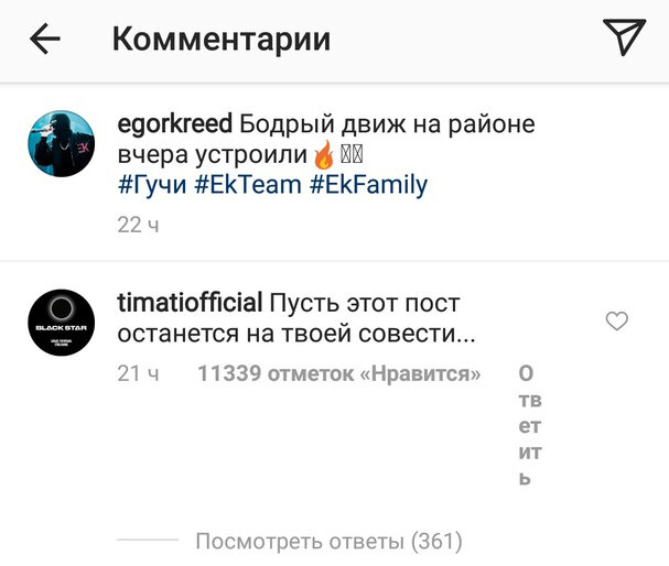 В комментариях к последним публикациям Егора Крида Тимати просит опубликовать пост про победительницу шоу "Холостяк", в котором артист принимал участие. Напомним, ранее Егор Крид раскрыл причину расставания с Дарьей Клюкиной. Однако это не остановило Тимати. Егор Крид в Instagram не реагирует на комментарии "главаря" Black Starа. "Пусть этот пост останется на твоей совести", - резюмирует Тимати. Однако в тот же день основатель и владелец лейбла Black Starа опубликовал на своей странице пост, напоминающий Егору Криду про должок. О чем будет этот "пост про Дашу" остается только догадываться.