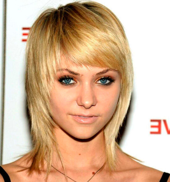- округленная челка, с удлиненными по сторонам прядями, смягчит выражение лица, удачно сочетается с длинными и средними волосами;
