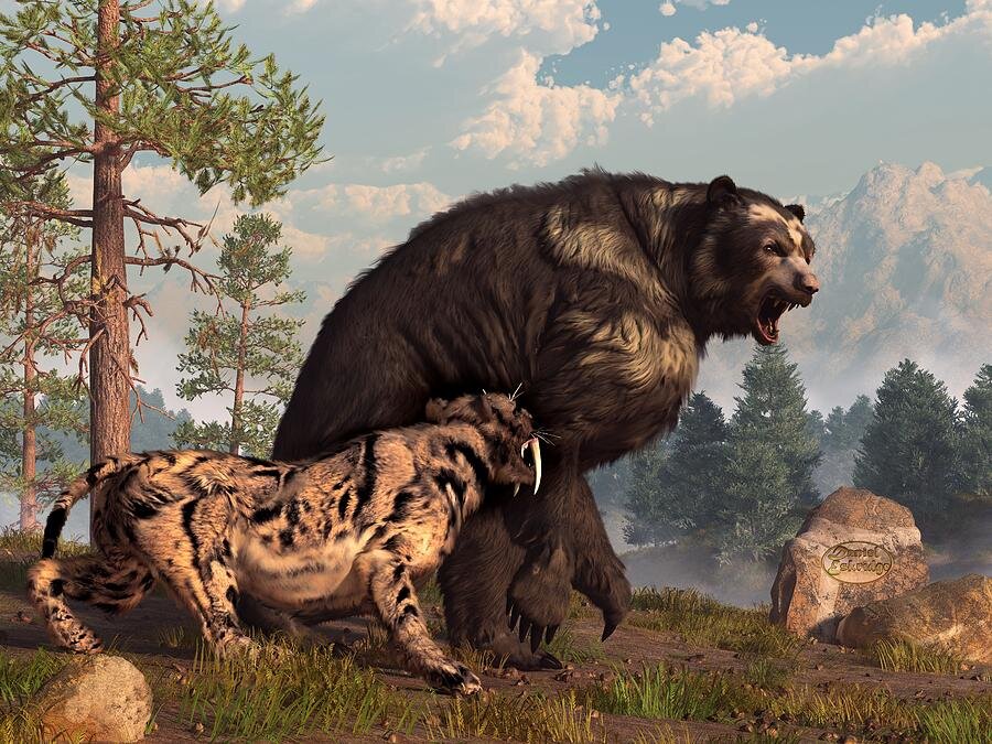 Почти миллион лет назад, по лесам Северной Америки бродил короткомордый медведь. Представьте Гризли. Свирепое существо. Так вот, а короткомордый достигал 3-х м в восоту, стоя на 4 лапах. А когда вставал на задние, то и все 6. Он мог перемещаться быстрее лошади. Был в два раза больше и сильнее гризли. В то вермя был один закон – убей или будешь убить. И в этом беспощадном мире короткомордый медведь превосходил других млекопитающих в этом и был безусловно королем. Он мог напасть на любое животное и убить его.