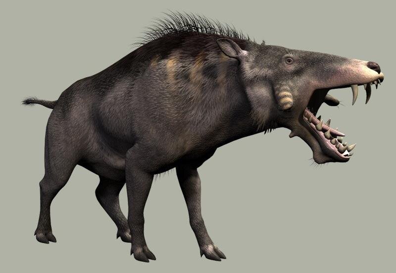 Высота в холке — около 1,8 м, длина — около 3,6 м, длина черепа 90 см, вес — 600—1000 кг. Внешне напоминал гигантского бородавочника с огромными челюстями, торчащими клыками и сильно выступающими скуловыми костями, которые вместе с выростами на нижней челюсти служили для крепления мощных жевательных мышц. Был хищником и падальщиком, способным раскусывать кости. Это подтверждается тем, что зубы на найденных черепах часто изношены и обломаны, как у современных гиен. При внушительной массе он развивал достаточно быструю скорость и сбивал с ног свою жертву. Многие миллионы лет — это существо было царем зверей. Однако он был очень глуп и свиреп. Именно это помешало ему выжить в эволюционирующей природе.