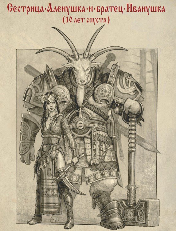 Проект «Сказки Старой Руси» — серия рисунков Романа Папсуева, которая сначала обрела популярность на просторах Сети, а затем увидели свет полноценные артбуки («Начало») и энциклопедии («Истоки»). Из обильного множества рисунков по «Сказкам Старой Руси» мы отобрали 10 самых главных. Это герои, которых все мы знаем с детства, но которые в мире «Сказок Старой Руси» предстают совсем иначе, чем мы могли себе представить. Сестрица Аленушка и братец Иванушка (10 лет спустя) Прошло 10 лет. Козленочек подрос... Он стал ее телохранителем и инструментом грубой силы. Оба персонажа — в целом положительные и на стороне добра, однако не гнушаются пользоваться и черной магией. Они — профессионалы высокой пробы, с нечистью беспощадны, непревзойденные мастера ближнего боя - Иванушка берет силой, Аленушка — ловкостью. Иванушка вообще силен как бык, поэтому таскает на себе все их с сестрой пожитки, плюс огромный молот, который он наивно называет «Молот Ведьм». Добрыня Никитич Известно, что это родстве