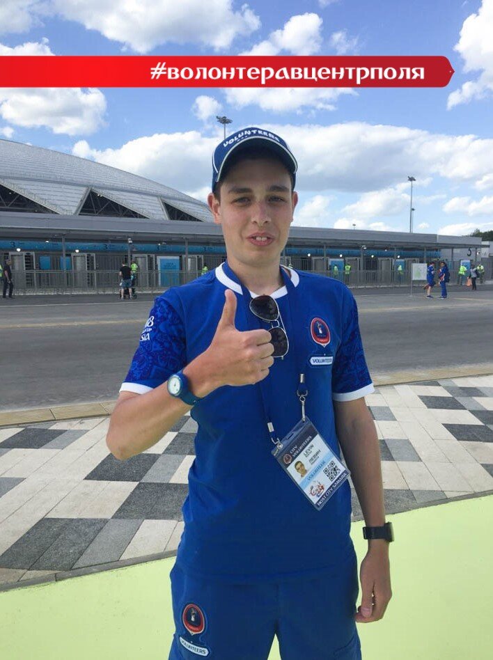 Левин Никита - один из самых юных волонтеров функционального направления "Лингвистическое сопровождение". Ему всего 16 лет, а он уже знает 2 языка - английский и немецкий, и вещает на них все самую важную и полезную информацию на последней миле стадиона с помощью рупора! Я учусь в школе с углубленным изучением иностранных языков, поэтому свободно общаюсь на английском. Я желаю всем волонтерам удачи и легких, но интересных смен!