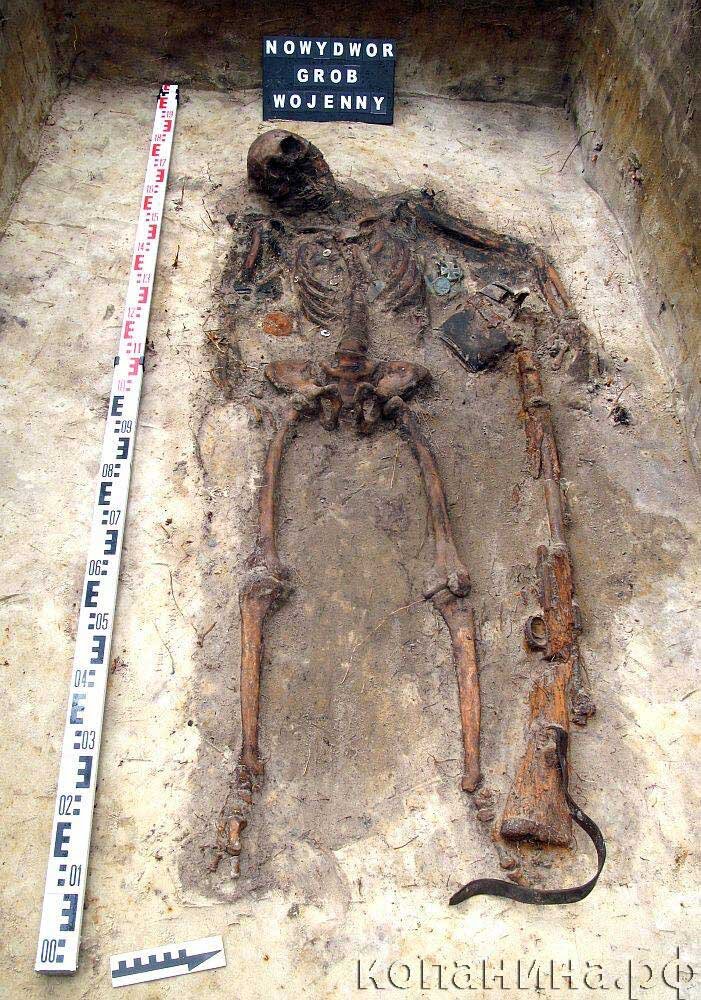 Найденная в Польше могила немецкого штабного офицера Копатель аккуратно расчищает скелет кисточкой, что бы не пропустить мелкие кости и находки Аккуратно раскопанная грудь немца. Все предметы лежат так как и были при захоронении. На ребрах вдоль позвоночника идет ряд пуговиц. На левой стороне груди знак за ранение и железный крест. На шее висел смертный медальон. В немецкой армии он состоит из двух половинок на которых указано подразделение, номер солдата и группа крови. При гибели солдата одна половинка остается на покойнике а вторая отламывается похоронной командой. Видна надпись "Штаб 28" на жетоне, в отверстие для шнурка пророс корень Награды погибшего - знак за ранение времен Третьего Рейха и железный крест за Первую мировую войну Крест крупным планом. Во Вторую мировую у немцев была аналогичная по дизайну награда но вместе W - свастика и год начала Второй мировой - 1939 Вместе с покойником лежал немецкий карабин Маузер 98к в плачевном состоянии Сгнивший приклад карабина с