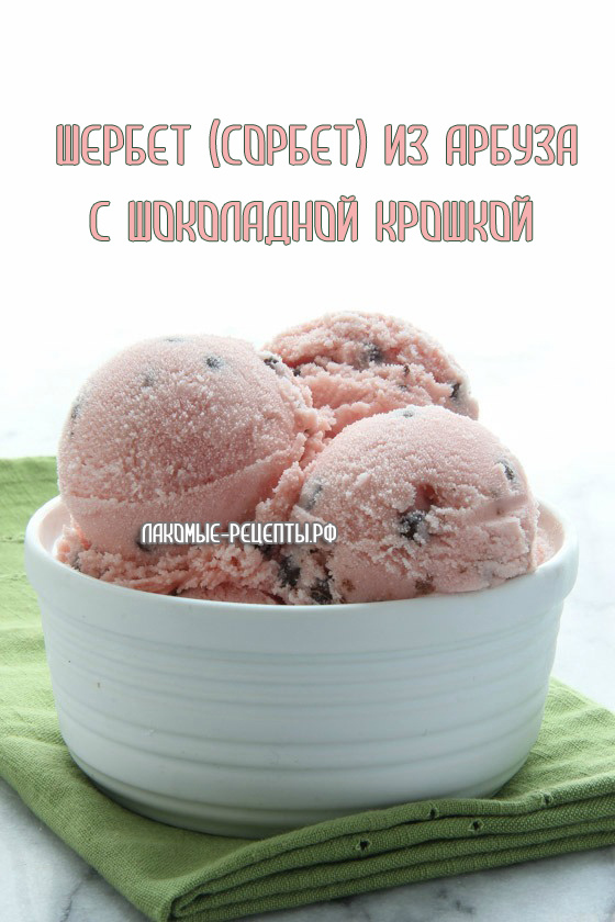 Ингредиенты на 4-6 порций арбузного шербета (сорбета) с шоколадом: Для арбузного сорбета (шербета) с шоколадной крошкой: Охлажденный арбузный сок — 2 ст. (500 мл)