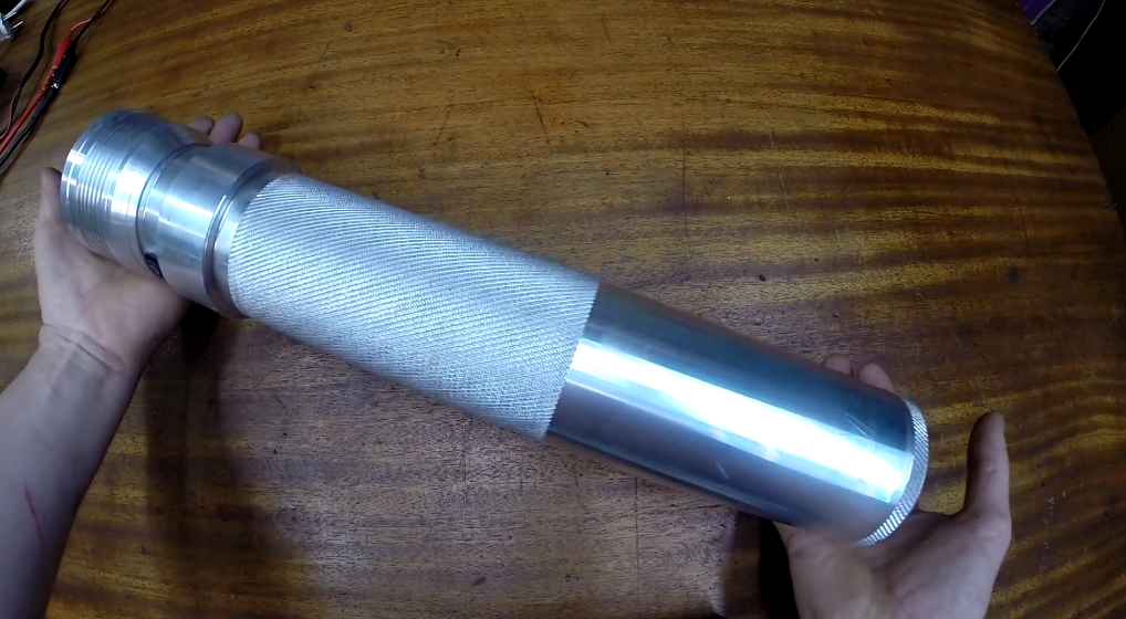 Для начала, размеры фонарика 45 см в длину и 85 мм диаметр в самой большой части. Запитывается этот фонарик от литий-полимерных аккумуляторов мощностью 5 Ампер/часов. Сейчас покажу, что у него там внутри. Крышечка откручивается и туда вставляются два литий-полимерных аккумулятора В верхней части находится вся электроника. И она так же откручивается от части с аккумуляторными батареями. Ниже видно, как выглядит внутри корпус для аккумуляторов. Все это делалось расточным токарным резцом. А вот самая основная часть, в которой установлен светодиод на 100 Ватт. В ней установлена такая гигантская автомобильная линза. А под ней установлена еще одна линза для светодиода Так же там установлен отражатель. Для работы фонаря соединяются последовательно 2 аккумулятора, чтобы получить напряжение 36 Вольт. Двух таких аккумуляторов хватает примерно на 2 часа работы. После разрядки аккумуляторов, их нужно вытаскивать и заряжать. На всякий случай лучше изолировать место соединения, чтобы избежать КЗ. В