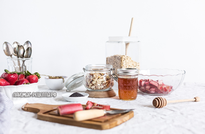 Кефир — 60 мл Для начинки хрустящей гранолы на завтрака с клубникой, маком и медом: Свежие ягоды клубники или любые другие в сезон — 2 чашки