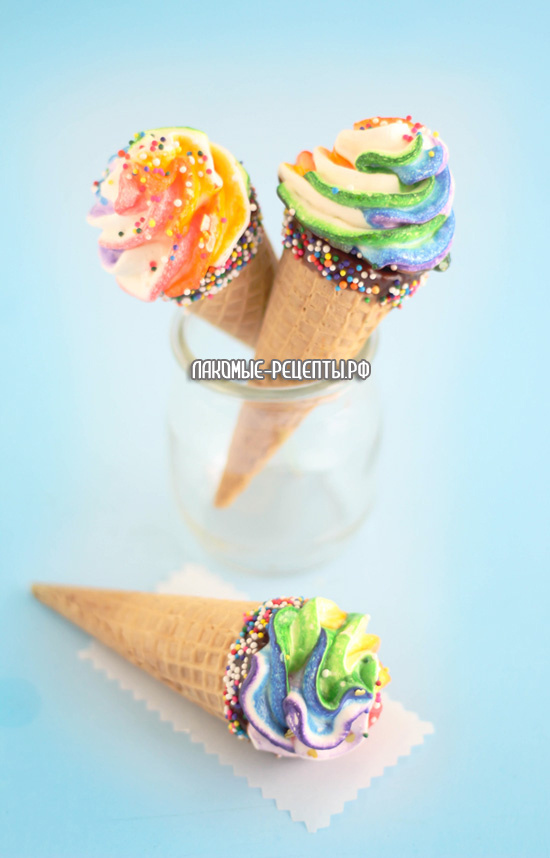 Ингредиенты на 20 радужных меренг и шоколадных вафельных рожков: Для шоколадных рожков: Вафельные рожки для мороженого (конусы) — 20 шт.