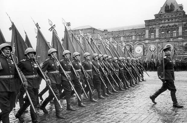 …В те времена не умели разгонять облака – потому двухчасовое действие (если быть точным – 122 минуты) пройдёт под проливным дождём. (Из-за этого придётся отменить пролёт авиации – между прочим, планировались почти шестьсот самолётов!..) Вообще, масштаб Парада поражает – согласно источникам, участвовало 24 маршала, 249 генералов, 2536 офицеров, 31 116 сержантов и солдат. Примерно половину от этой численности составляли фронтовики – десять сводных полков пятибатальонного состава от фронтов, и один – от ВМФ.