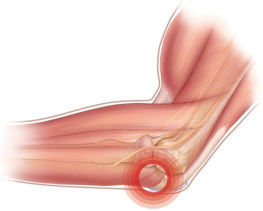 - Бурсит локтевого сустава (часто из-за длительного давления на сустав или из-за травмы), характерна боль в задней области сустава, часто сопровождается жесткостью, припухлостью и жжением, в отдельных случаях инфицированием суставной сумки;