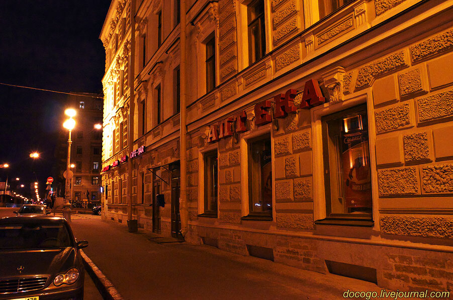 Это, наверное, единственное стихотворение Александра Блока, известное всем и каждому учившемуся в советской или российской школе. Стихотворение суицидальное, рисует нам депрессивную картинку. Удивительно, казалось бы, что здесь депрессивного? Наоборот, если вспомнить вечернюю картинку, когда в темноте уютным желтым кружком выхвачено пятнышко, где тепло и не льёт дождь, ассоциации должны быть иными. Что не так в мире Блока? Вот, кстати, аптека на улице Декабристов (быв. Офицерской) рядом с домом, где жил поэт. Сохранилась с тех самых времен.