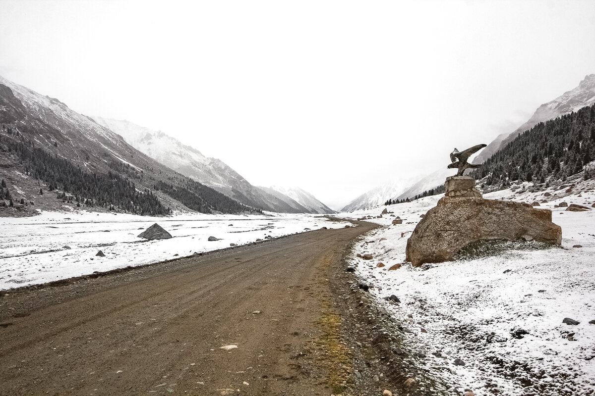 На календаре второе мая. Слишком рано, для штурма горного перевала в 4000 метров. Но именно такой высоты перевал, отделяет нас от цели нашего маршрута... А цель маршрута - заброшенный советский город в кольце высоких гор.. Погода, не самая приветливая. Тяжелые снежны облака, цепляют за горные вершины... А мы поднимались все выше, навстречу этим самым облаками. И чем выше мы поднимались, тем меньше становилось кислорода в воздухе и тем больше становилось снега вокруг. На самом гребне перевала все и вовсе превратилось в "белое марево". Из машины пришлось выйти, что облегчить нагрузку на двигатель и хоть чуть чуть, но увеличить клиренс. Впрочем, пешком было идти даже быстрее. Сложность трассы и угол ее наклона, слабо мотивировали садиться в машину до тех пор, пока мы не выедем, на что-то более ровное. Солнце еле еле пробивалось через пелену облаков, а перевал все еще не заканчивался. Наконец-то, вершина перевела преодолена и можно продолжать движение на машине. "Delica" - прекрасный ав