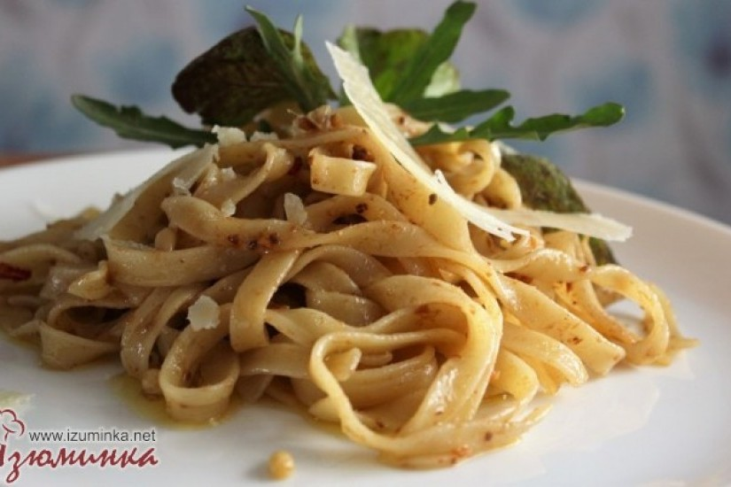 - Готовую пасту переложить в сковороду с маслом и специями, перемешать, добавить кедровые орешки и подать, присыпав тертым пармезаном.