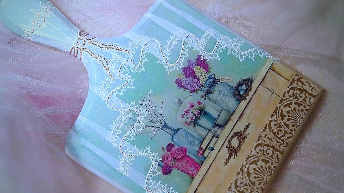 Имитация вуали в декупаже — это популярный способ добавить работе нежности. Данный способ декора также прекрасно подойдет не только для разделочной доски, но и для панно, крышки шкатулки или другой плоской поверхности.