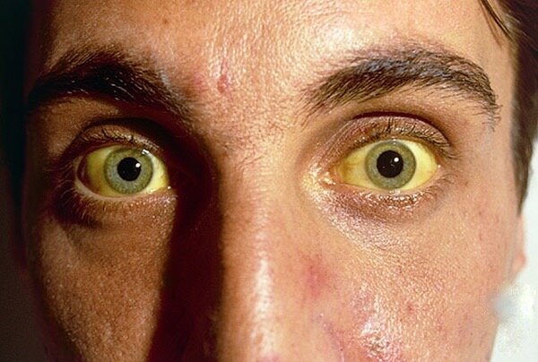 - Желтая кожа и глаза, которые могут быть признаками желтухи