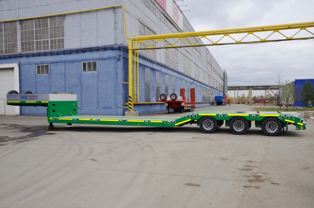 Низкорамный трал ТСП 94183-0000010-5AL0 с "ломаной" рамой пополнил линейку облегченных полуприцепов "Политранс". Его погрузочная высота составляет всего 540 мм., а длина погрузочной платформы составляет 7 метров.Такая конструкция позволит перевозить технику высотой 3 метра. Грузоподъемность полуприцепа - 32,4 тонны, снаряженная масса - 9,9 тонны. Для достижения таких показателей в конструкции рамы полуприцепа применялась сталь с высокими прочностными характеристиками. Подвеска полуприцепа - пневматическая, шины малой размерности 235/75R 17,5/12+2. Для обслуживания на платформе расположен технологический люк. Низкорамник оснащен приставными алюминиевыми трапам. Они легкие, прочные, в транспортном положении хранятся в специальной нише на платформе. Продуманная эргономика хранения позволяет без труда установить их в места крепления. Трапы могут смещаться наружу на 25 см. Приставные трапы снижают собственный вес полуприцепа, при движении трала не образуется эффект "парус