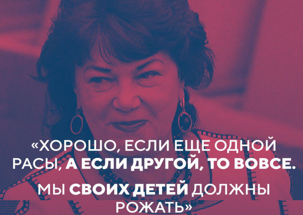 В стране, где победа над фашизмом является одной из основ государственного самосознания, лидеры этой самой страны допускают как минимум спорные высказывания. Так, Председатель комитета Госдумы по вопросам семьи, женщин и детей, депутат от КПРФ Тамара Плетнёва рекомендует россиянкам не вступать в половую связь с иностранцами во время ЧМ-2018. "Что я могу сказать ещё? Что найдутся девушки, которые встретятся и потом родят? Может, найдутся, а может нет, я надеюсь. Уже в голове что-нибудь проясняется. Эти детишки потом страдают, и страдали ещё со времён советской власти. Хорошо, если ещё одной расы, а если другой расы, то вовсе... Мы своих детей должны рожать. Я не националист, но тем не менее. Я знаю, что страдают и дети, и их потом бросают, и всё, и они остаются тут с мамой". "Потом ходят ко мне в комитет такие, плачут девочки, что ребёнка увезли, забрали и так далее". Если кто-то забыл, Тамара Васильевна прославилась еще в феврале 2018 года, став автором новейшего слова во взаим