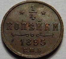 1895 год был промежуточным, между подписанием манифеста о восшествии Николая II на престол в 1894, и его коронацией в 1896. Теоретически в этот год монеты должны были быть чеканены еще под инициалами Александра III, то начиная с 1894, идет чеканка под вензелем и профилем Николая II. Если 1894, был пробным годом, то в 1895 вышла полная линейка монет. Но монеты чеканили небольшими партиями, что и повлияло на их цену, на данный момент. 1/4 копейки 1895 года. Цена за монету 16000 рублей. 1/2 копейки 1895 года. Средняя цена 1700 рублей. 1 копейка 1895 года. Средняя цена 1200 рублей. 2 копейки 1895 года. Средняя цена 500 рублей. 3 копейки 1895 года. Средняя цена 750 рублей. 1 penni 1895. Монета, отчеканенная для Финляндского княжества Российской империи. Средняя цена 600 рублей. 10 pennia 1895. Монета, отчеканенная для Финляндского княжества Российской империи. Средняя цена 600 рублей. Вообще с царской медью интересная ситуация. Монеты в идеальной сохранности интересуют всех, но