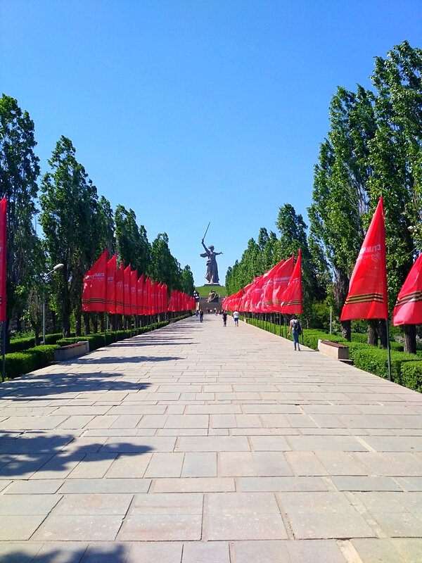 Начало Осмотр достопримечательностей Волгограда мы решили начать с Мамаева кургана, благо его было видно из окна нашей гостиницы и по азимуту до него было километра два. Думаю, что все и так знают, что это за Мамаев курган такой, но на всякий случай коротко расскажу. Свое название курган получил еще во времена Золотой Орды. Есть легенда, что там похоронен темник Мамай в гробнице и золотых доспехах. Захоронение, правда, не нашли, но название осталось. Во время Сталинградской битвы за курган шли особо ожесточенные бои, поскольку с этой высоты весь город был как на ладони, что давало возможность корректировать огонь и/или обстреливать без помех всю округу. Ну а в 1967 году на кургане открылся мемориальный комплекс «Героям Сталинградской битвы». Чтобы добраться до монумента «Родина-мать зовет!» придется пройти по нескольким лестницам и аллеям. Кстати, общее число ступеней от подножия кургана до его вершины — 200, по числу дней Сталинградской битвы. При температуре за 30 градусов карабкатьс