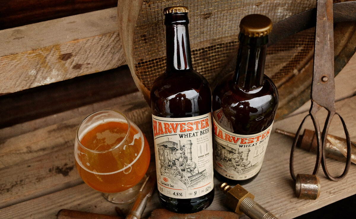 При создании этикетки мы вдохновились винтажными рекламными макетами в газетах начала прошлого столетия и стимпанк-культурой. «Harvester» — это чудо-комбайн из мира научной фантастики, собирающий пшеницу и сразу же варящий пиво, конечно же пшеничное пиво.