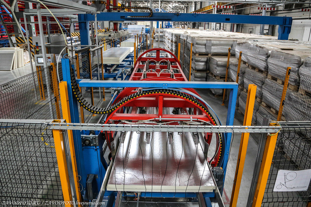 На заводе «Лоджикруф ПИР» тоже есть свой гигантский охладитель (патерностер), который вмещает до 2 000 кв.м. продукции. Здесь плиты должны вылежаться для завершения химической реакции около 30-60 минут в зависимости от толщины.