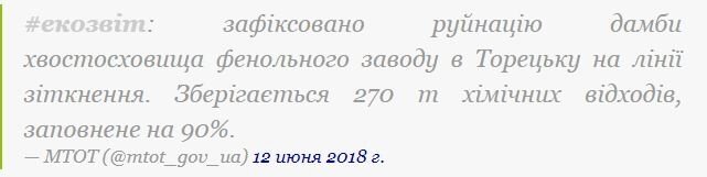 Согласно информации на сайте «Ведомостей-Украины», было зафиксировано частичное разрушение дамбы Дзержинского фенольного завода в городе Торецке, расположенном на линии соприкосновения украинской армии и сил Донецкой Народной Республики (ДНР). Украинский ресурс отмечает, что на территории завода, заполненного на 90%, хранятся порядка 270 тонн химических отходов.