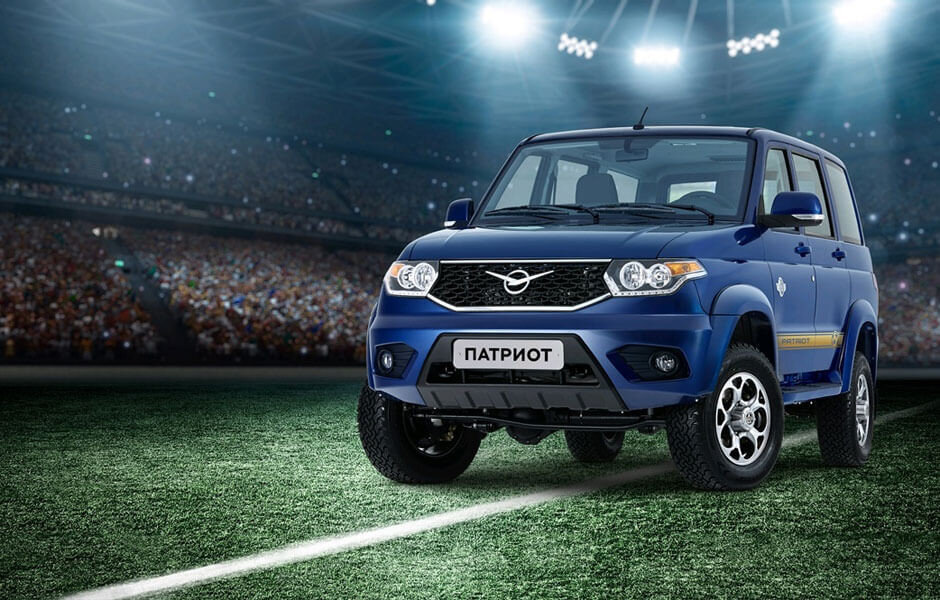 Ульяновский автозавод приступил к продажам эксклюзивной версии UAZ Patriot, посвященной чемпионату мира по футболу в РФ. Цена такого автомобиля составляет почти миллион рублей — 995 тыс. руб., что на 4 тыс. дешевле, по сравнению с топовым вариантом внедорожника «Максимум», а также на 66 тыс. дороже исполнения «Престиж». Спецверсия предлагается с кузовом особого темно-синего оттенка. Помимо оригинальной окраски к новому Patriot прилагаются соответствующие наклейки для кузова, шильдики с изображенным на них футбольным мячом, литые диски колес черного цвета и атермальное заднее остекление. Внутри «футбольный» внедорожник отделан качественной кожей, простроченной нитью контрастного цвета. Кожаной отделкой могут похвастаться не только сидения, но и рычаг КПП вместе с «ручником». В основе новинки лежит одна из самых дорогих версий модели — «Престиж». В список ее оборудования по умолчанию включены обогреваемые кресла 1-го ряда и руль, медиасистема с навигацией, система автоматического упр